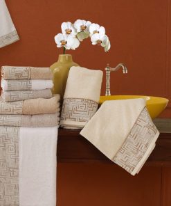 Una coppia di asciugamani: viso + ospite, perfettamente coordinata colore panna con balza jacquard labirinto.