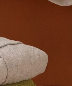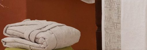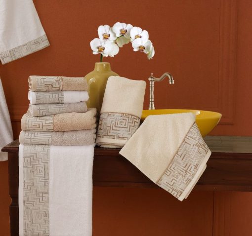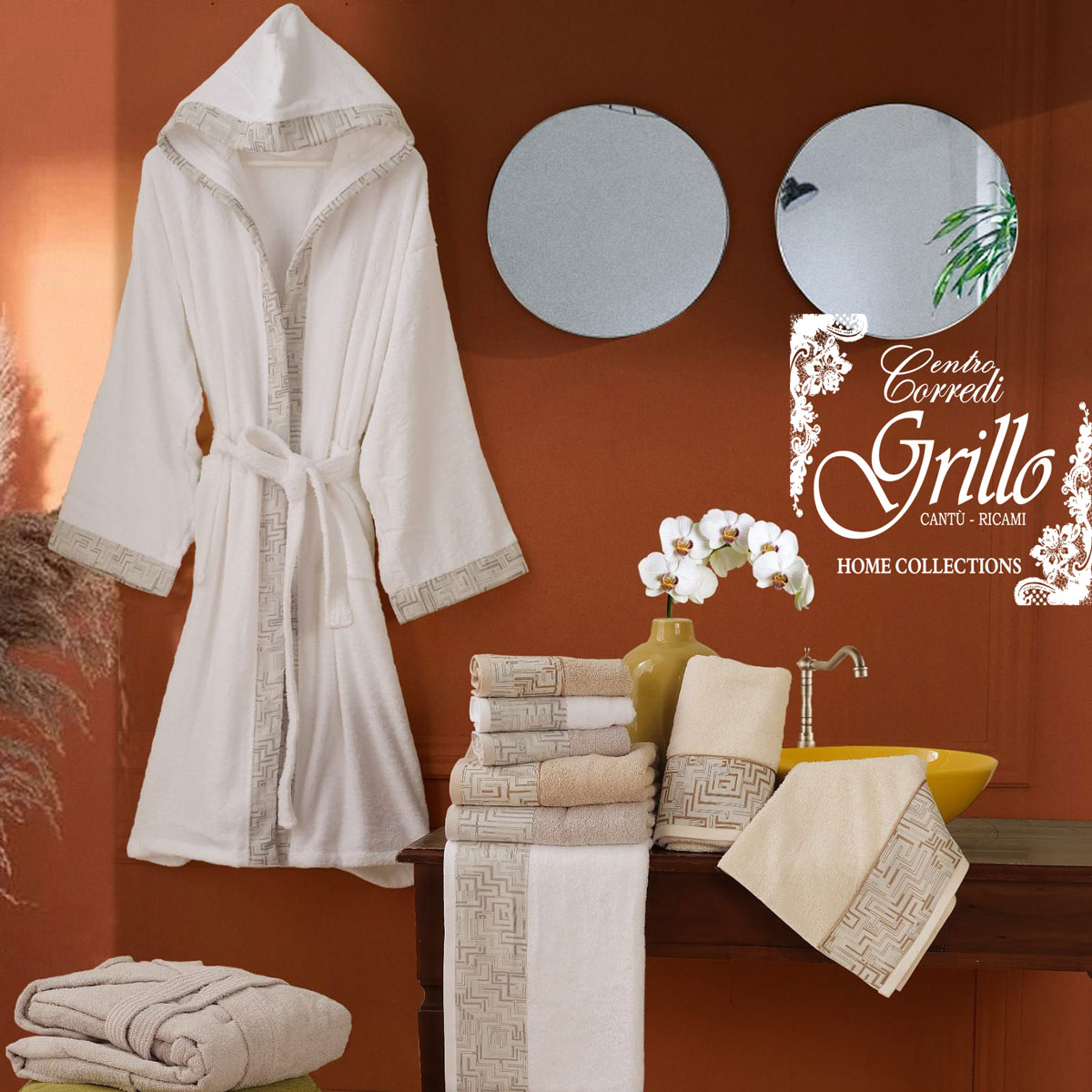 Carezzevole spugna impreziosita da bordo jacquard design labirinto.