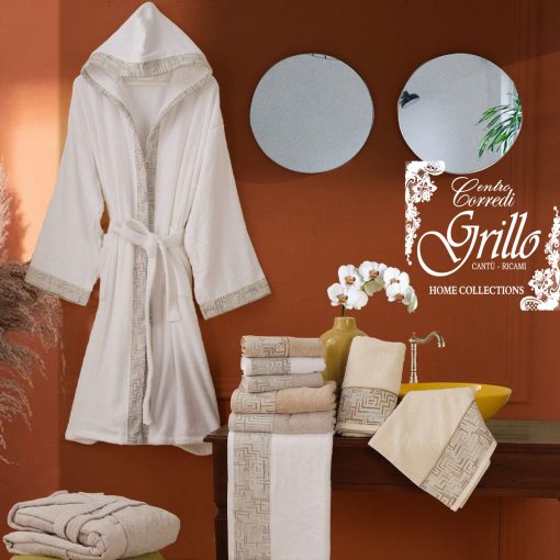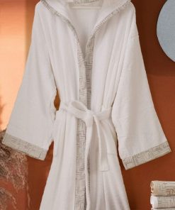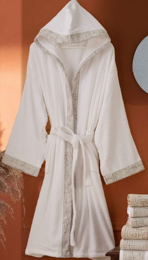 Accappatoio Donna taglia M colore panna, con balza jacquard design labirinto, cappuccio e tasche.