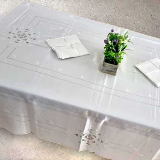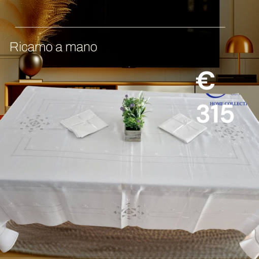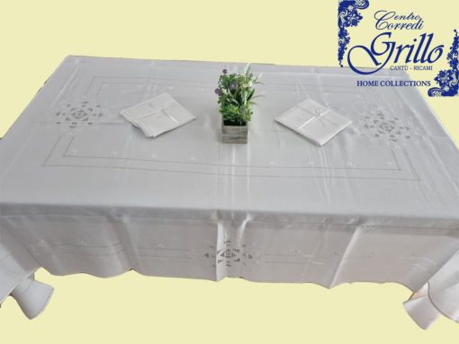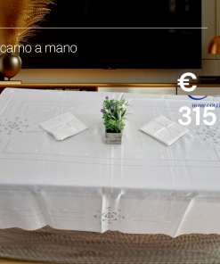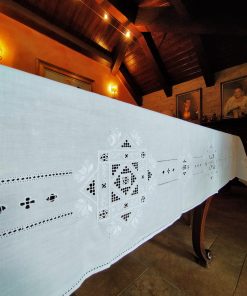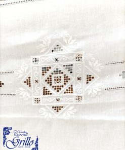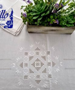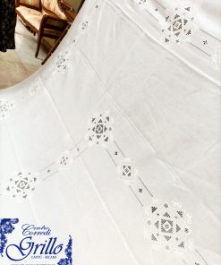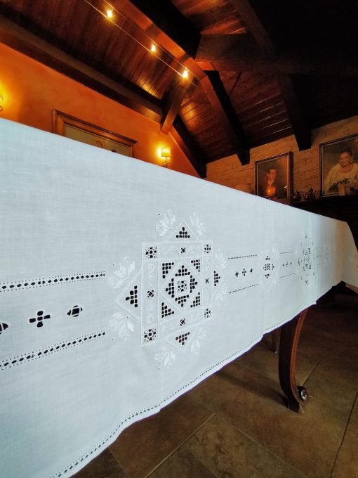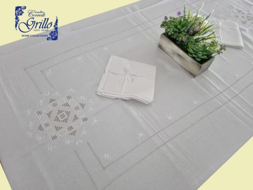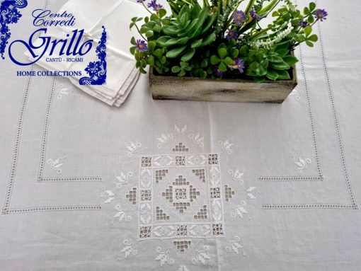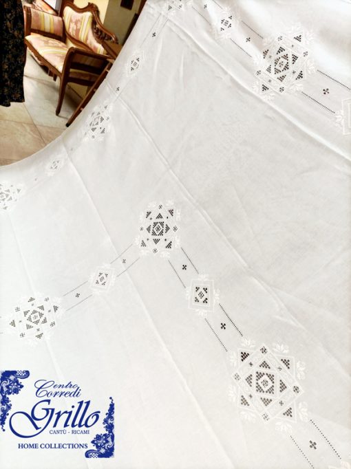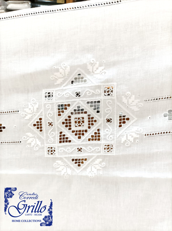 Ricamo a mano: punto antico, sfilature continue di gigliucci, punto pieno presenti in continuità su piano tavola e calata.
