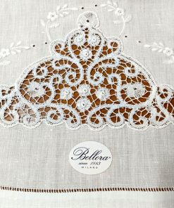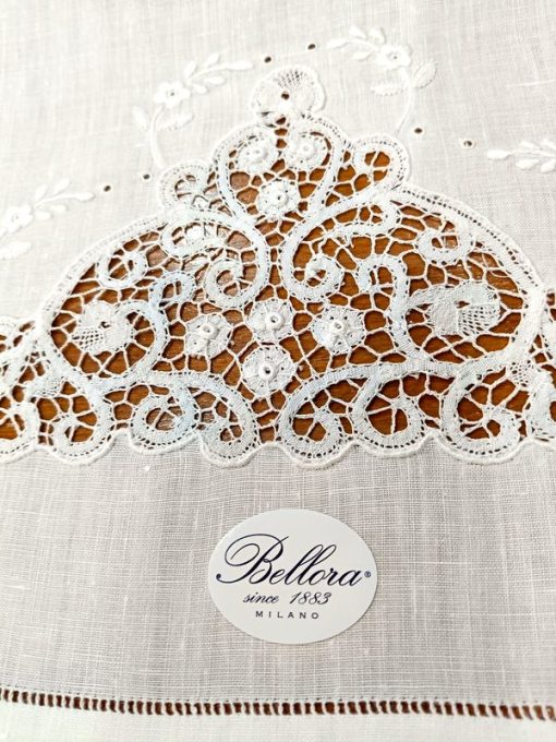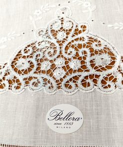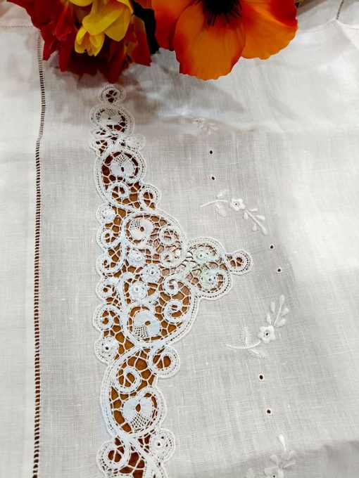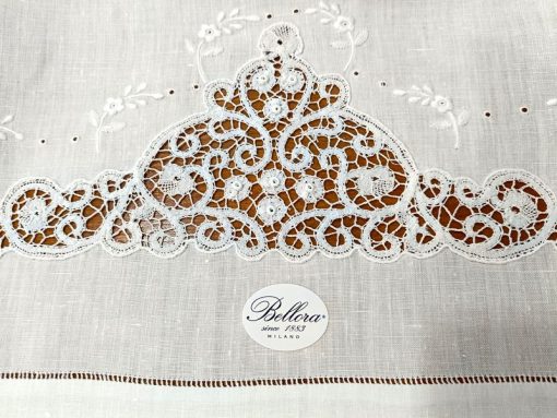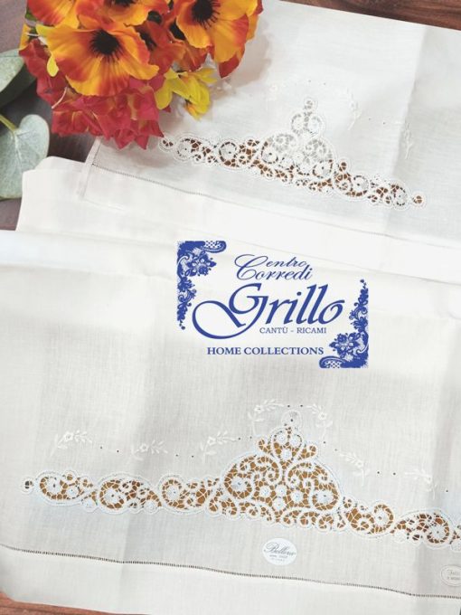 Il puro lino accoglie l’arte del meticoloso e prestigioso pizzo Cantù, realizzato a mano dalle nostre ricamatrici in sede (MESSINA):