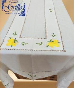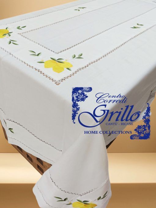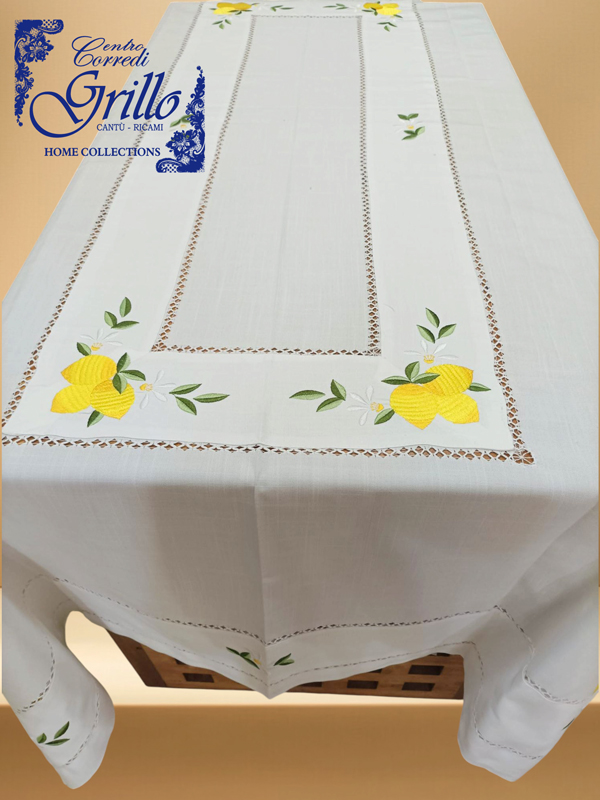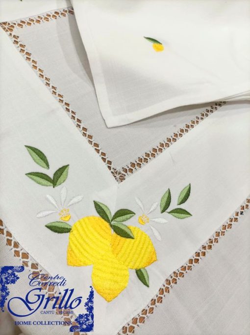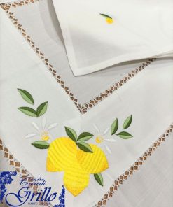 Il bordo è impreziosito da un finissimo gigliuccio eseguito a mano, che aggiunge un tocco di artigianalità e pregio. La balza in panama, applicata con cura sul piano tavola, riprende il tema agrumato con ulteriori ricami di limoni, per un effetto armonioso e decorativo.